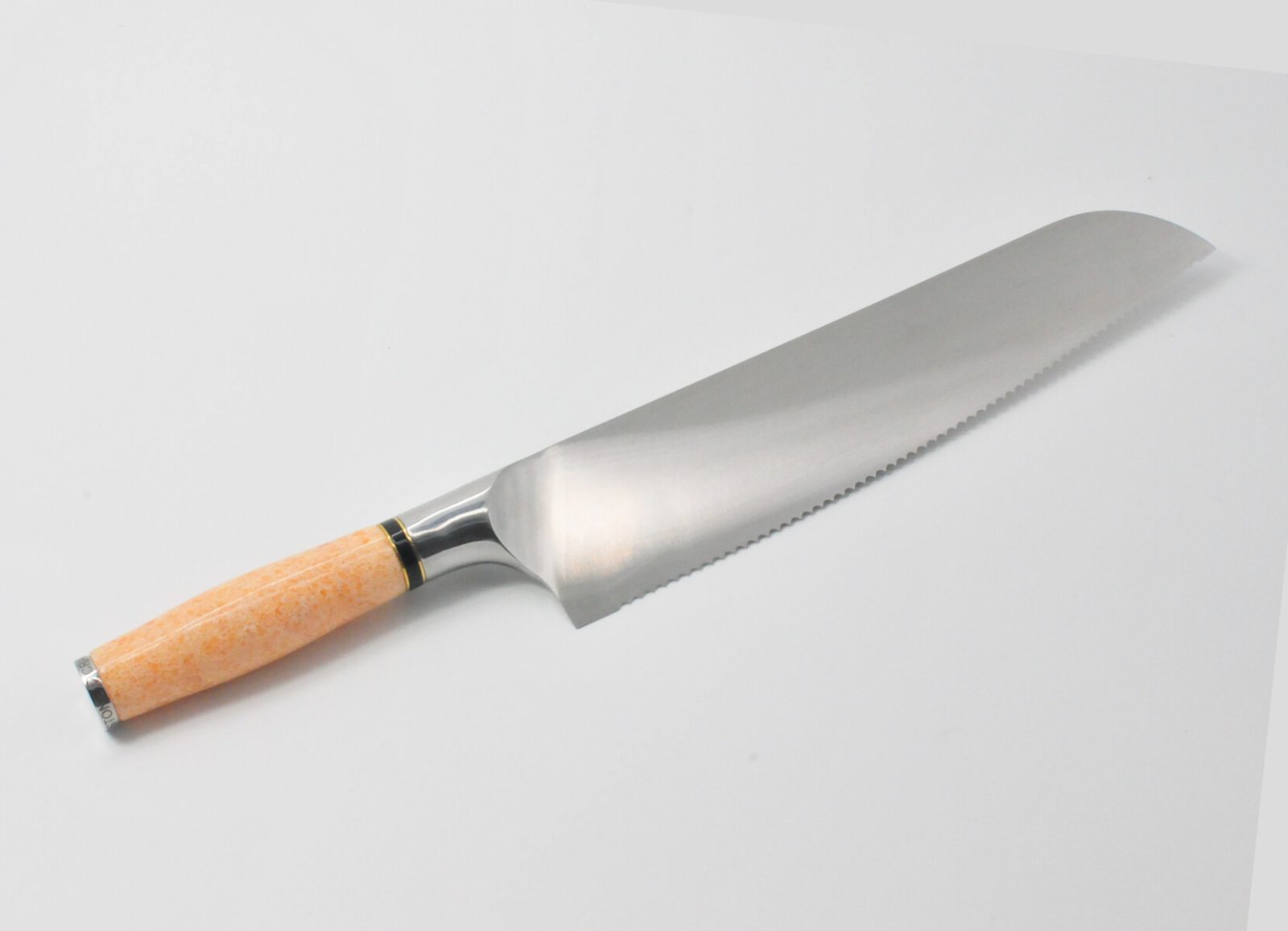 10 Inch Bread Knife with a Rosy Marble Handle, a Black Cubic Zirconia Stone at the Back of the Knife and Black Onyx and Brass Decorative Rings