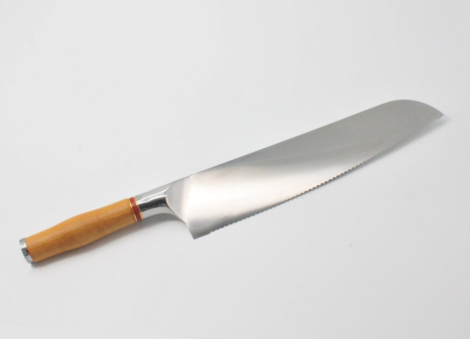 10 Inch Bread Knife with a Torrefied Maple Handle, a Garnet Colored Cubic Zirconia Stone at the Back of the Knife and Brass and Red Jasper Decorative Rings