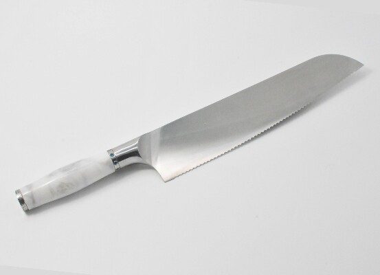 10 Inch Bread Knife with a Volakas Marble Handle, Swiss Blue Cubic Zirconia Stone at the Back of the Knife and a Swiss Blue Cubic Zirconia 8 Gemstones Stainless Steel Ring