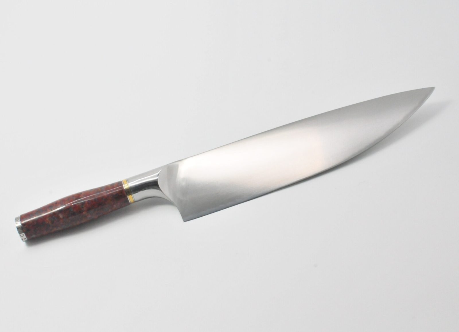 10 Inch Chef Knife with a Red Granite Handle, a Garnet Colored Cubic Zirconia Stone at the Back of the Knife and Brass and Stainless Steel Decorative Rings