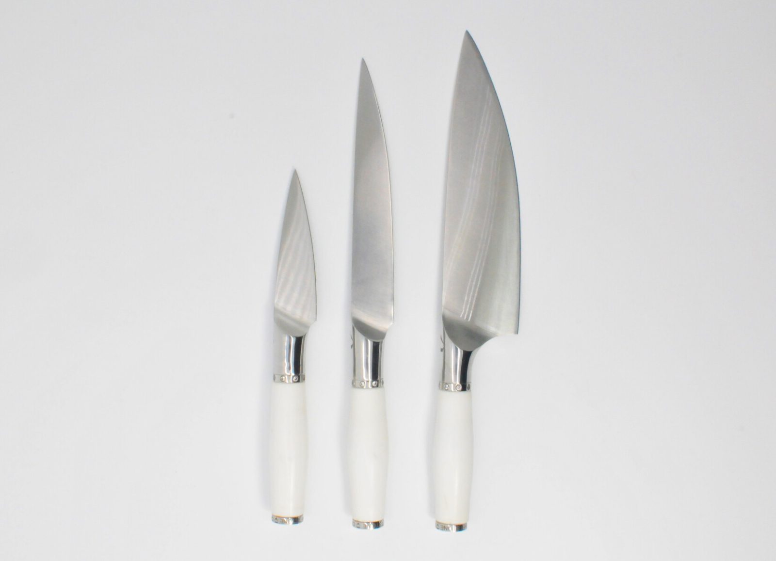 3 Knife Set with a Calcutta White Marble Handle, White Cubic Zirconia Stone at the Back of the Knife and a White Cubic Zirconia 8 Gemstones Stainless Steel Decorative Ring