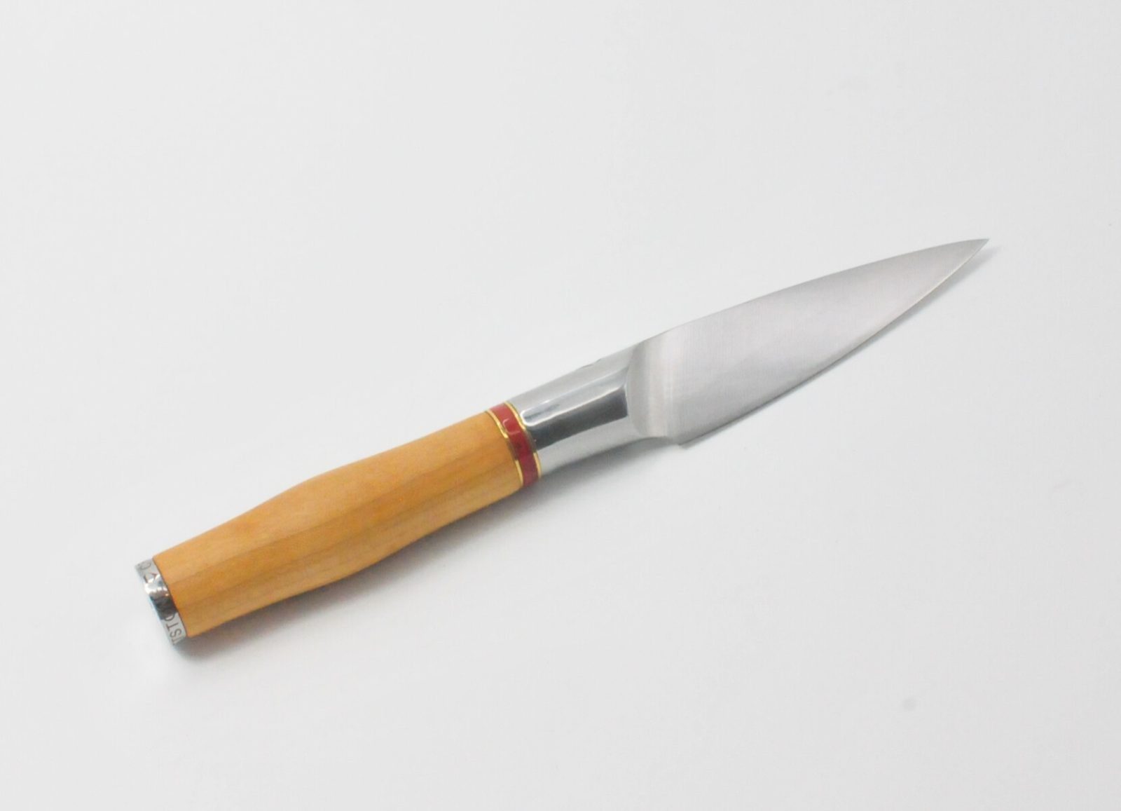 4 Inch Paring Knife with a Torrefied Maple Handle, a Garnet Colored Cubic Zirconia Stone at the Back of the Knife and Brass and Red Jasper Decorative Rings