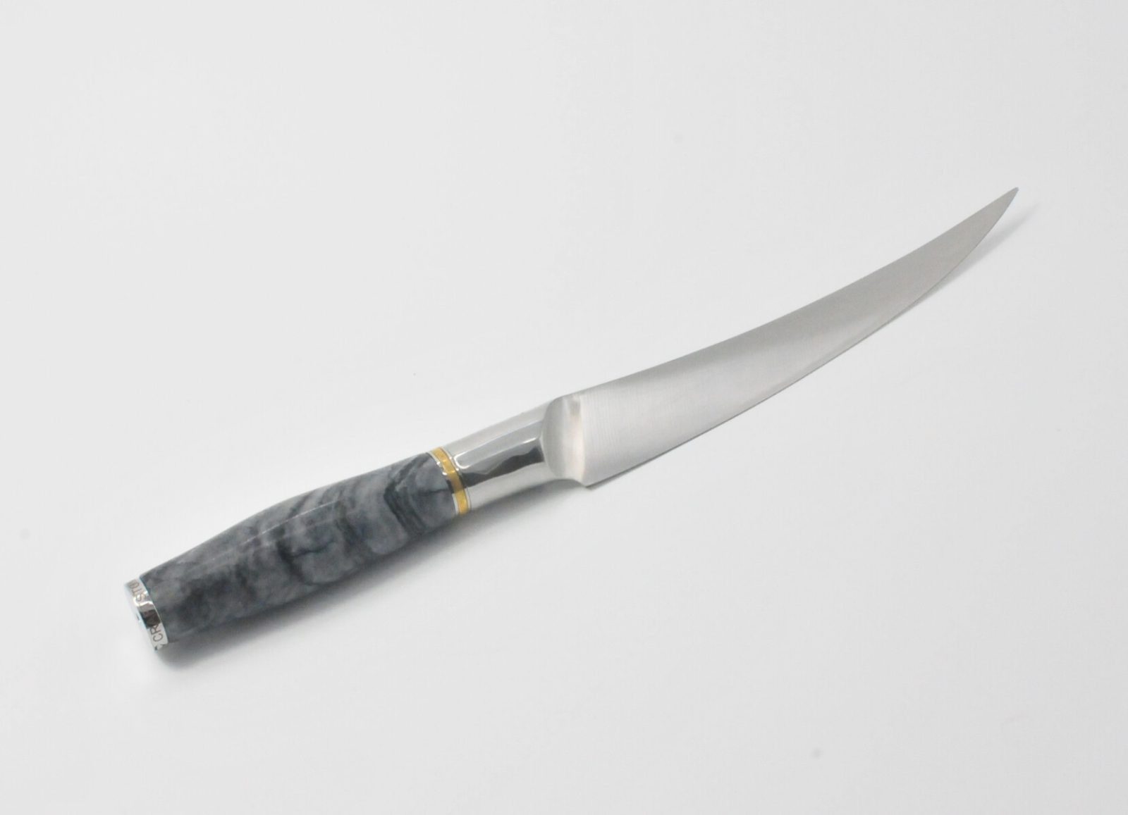 7 Inch Filet Knife with a Ancient Wood Vein Marble Handle, a Champagne Cubic Zirconia Stone at the Back of the Knife and Brass and Stainless Steel Decorative Rings