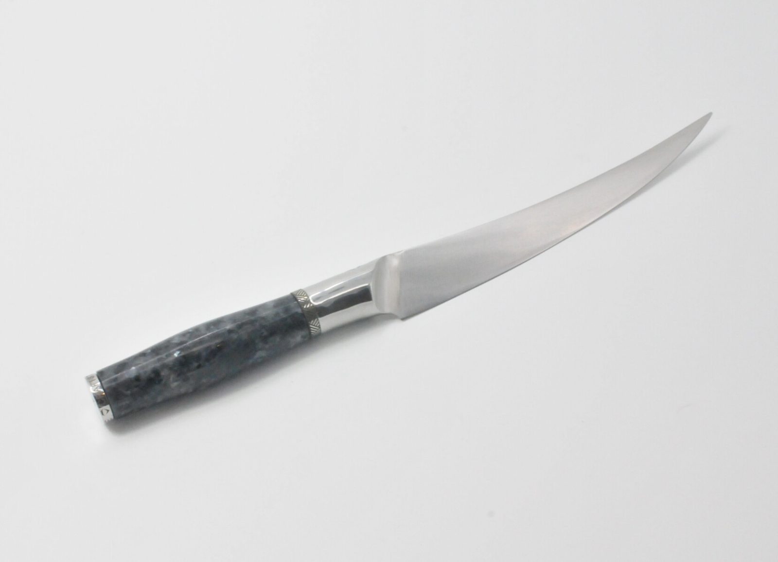 7 Inch Filet Knife with a Moonlight Grey Granite Handle, Aqua Blue Cubic Zirconia at the Back of the Knife and a Stainless Steel Engraved Aztec Decorative Ring