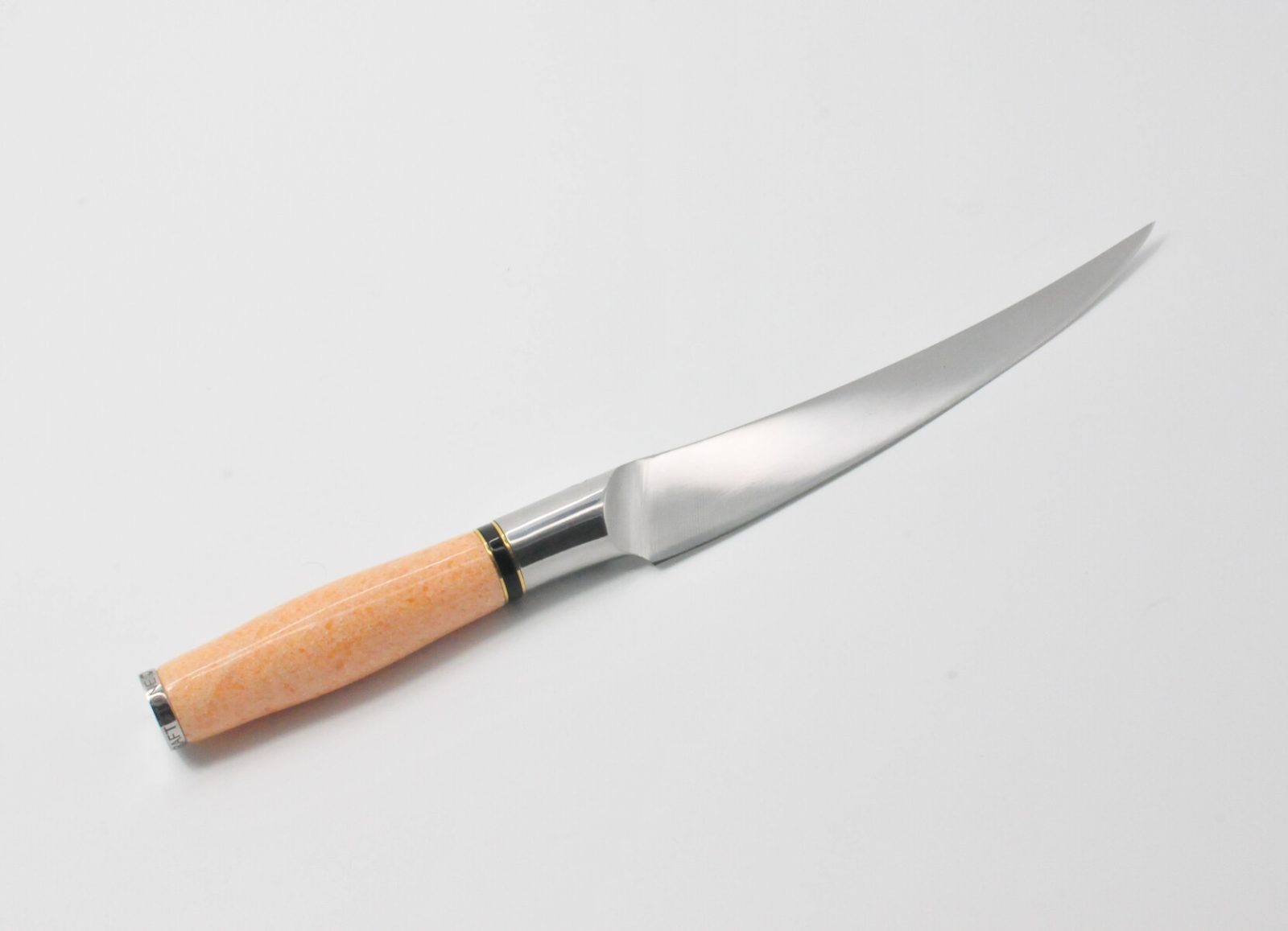 7 Inch Filet Knife with a Rosy Marble Handle, a Black Cubic Zirconia Stone at the Back of the Knife and Black Onyx and Brass Decorative Rings