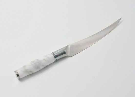 7 Inch Filet Knife with a Volakas Marble Handle, Swiss Blue Cubic Zirconia Stone at the Back of the Knife and a Swiss Blue Cubic Zirconia 8 Gemstones Stainless Steel Ring