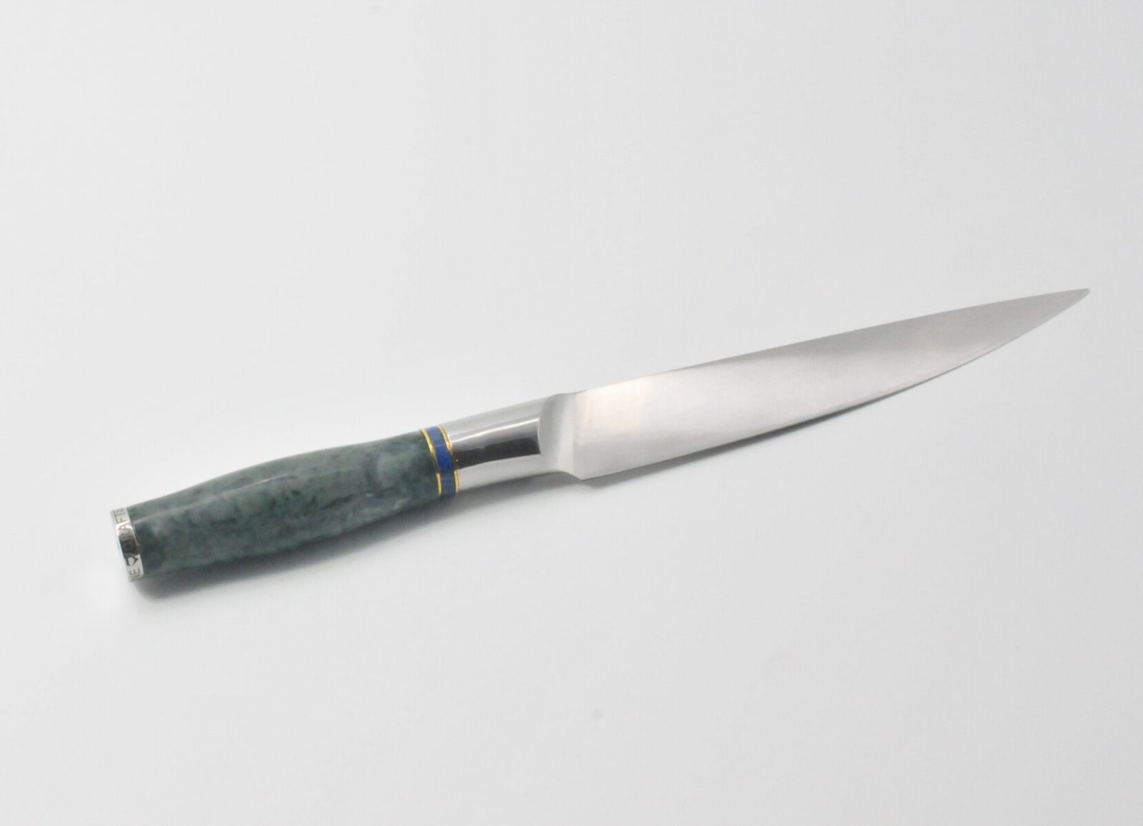 7 Inch Utility Knife with a Dark Indian Green Marble Handle, Swiss Blue Cubic Zirconia Stone at the Back of the Knife and Lapis and Brass Decorative Rings