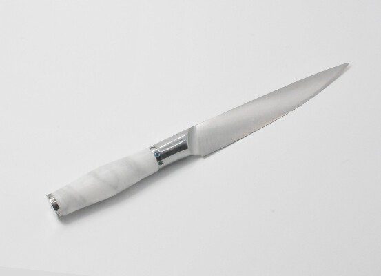 7 Inch Utility Knife with a Volakas Marble Handle, Swiss Blue Cubic Zirconia Stone at the Back of the Knife and a Swiss Blue Cubic Zirconia 8 Gemstones Stainless Steel Ring