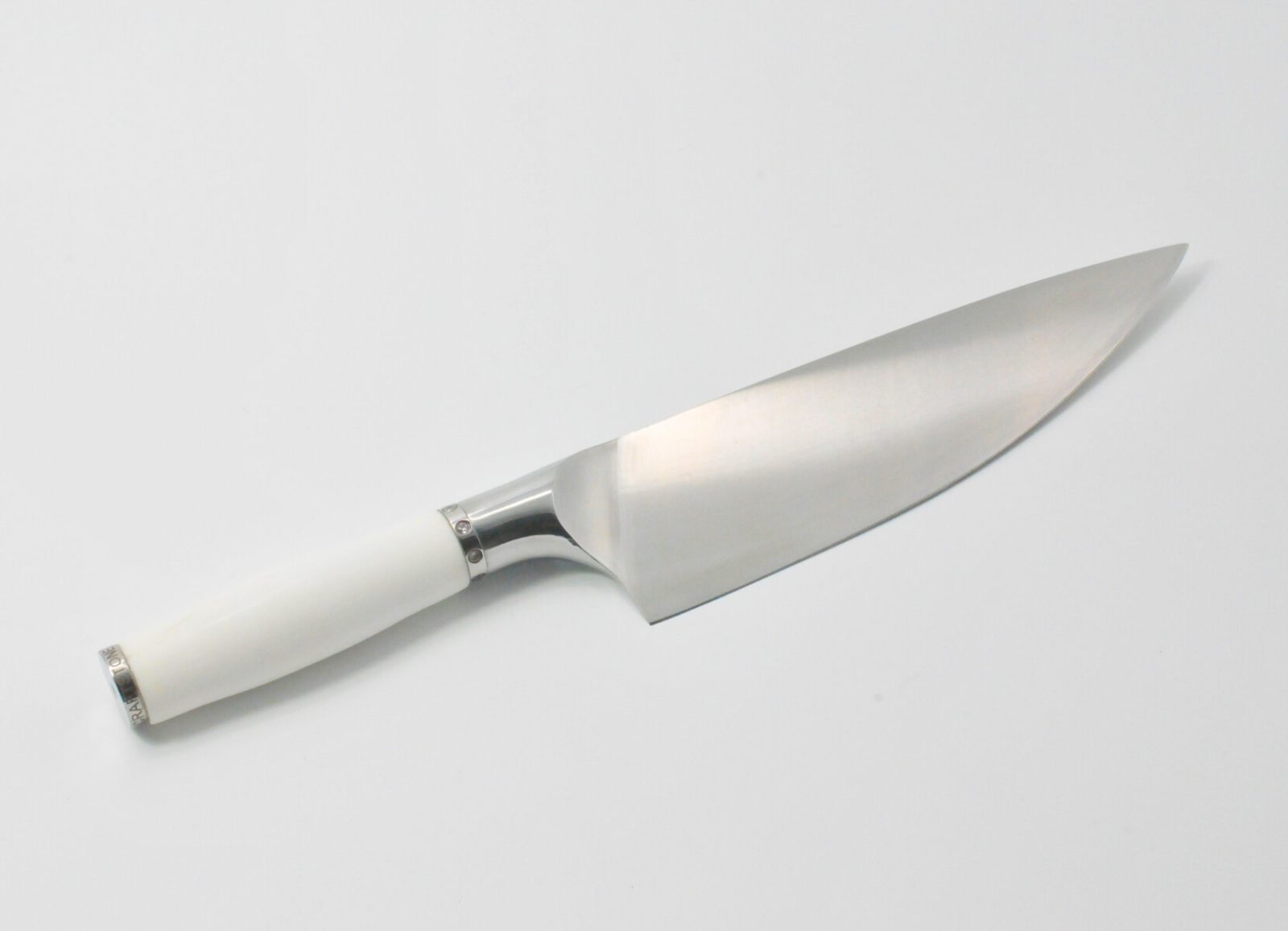 8 Inch Chef Knife with a Calcutta White Marble Handle, White Cubic Zirconia Stone at the Back of the Knife and a White Cubic Zirconia 8 Gemstones Stainless Steel Ring