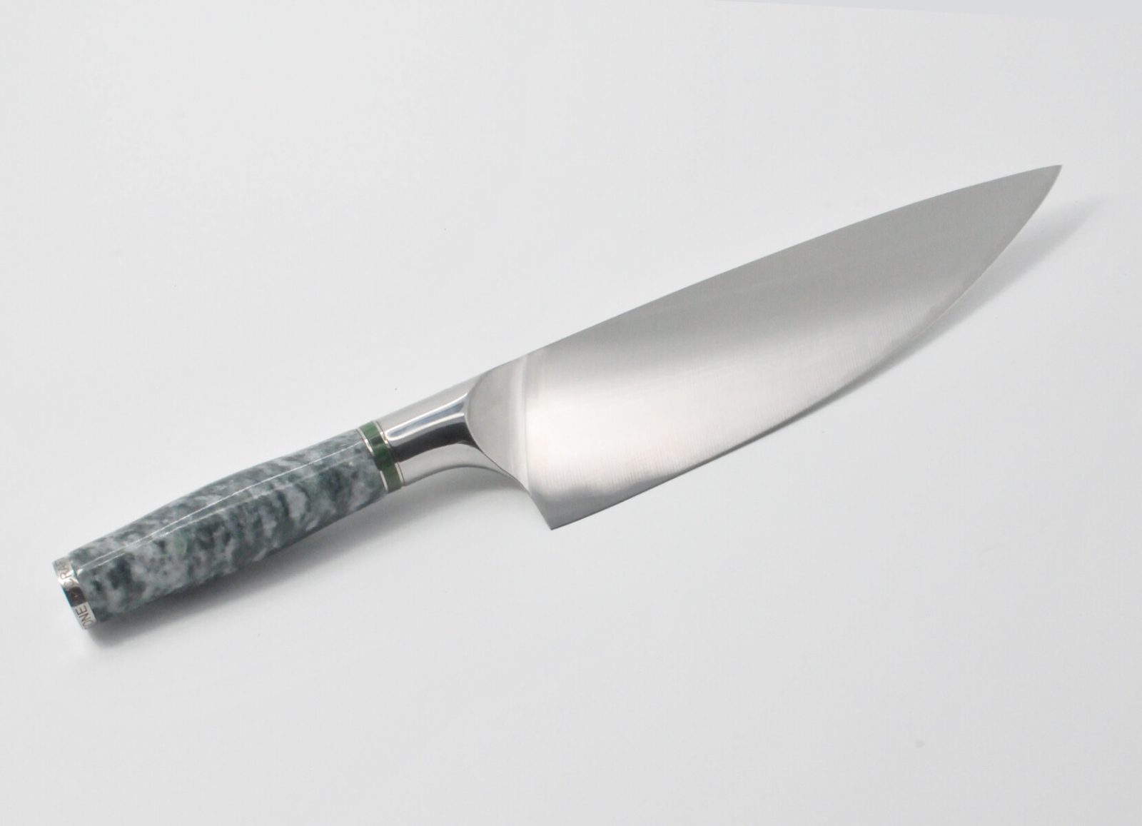 8 Inch Chef Knife with a Mossy Green Marble Handle, a Cubic Zirconia Peridot Color Stone at the Back of the Knife and Green Jade and Stainless Steel Decorative Rings