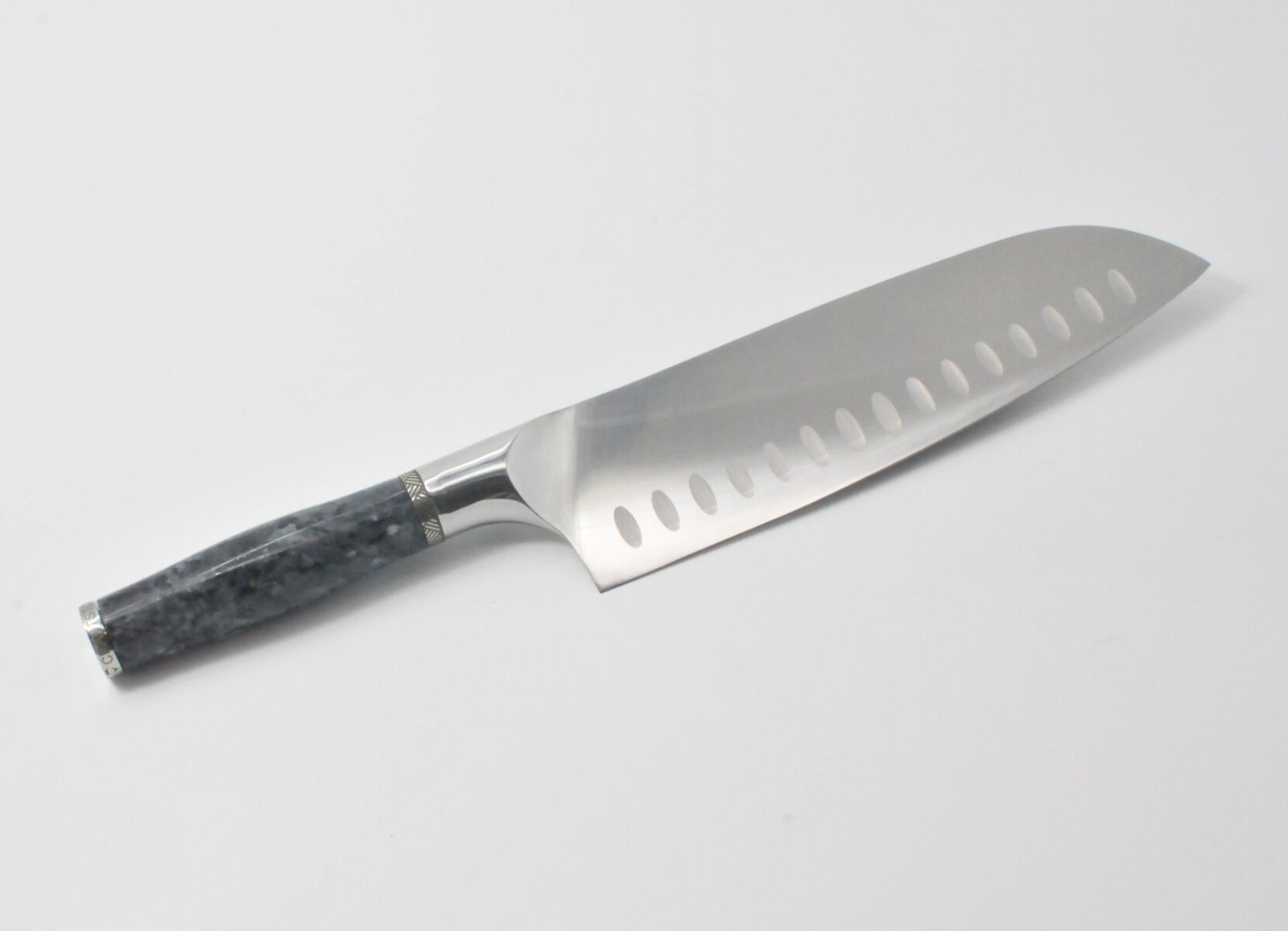 8 Inch Santoku Knife with a Moonlight Grey Granite Handle, Aqua Blue Cubic Zirconia at the Back of the Knife and a Stainless Steel Engraved Aztec Decorative Ring